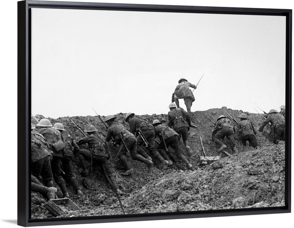 <p>Allied troops 'going over the top,' or advancing over their own trench during the Battle of the Somme. Photograph, 1916.</p>