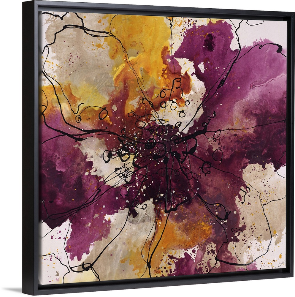 <p>Abstract painting using bright purple and gold colors in radial splashes almost appearing ad flowers.</p>