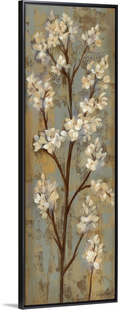 <p>This tall vertical piece consists of a painting of a tall branch with white flower petals.</p>