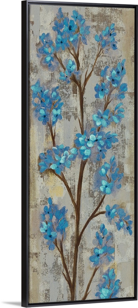 <p>Tall vertical artwork of blue contemporary flowers over distressed background.</p>