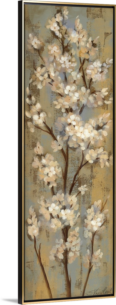 <p>Vertical panoramic painting of long vertical branches covered in small flowers.</p>
