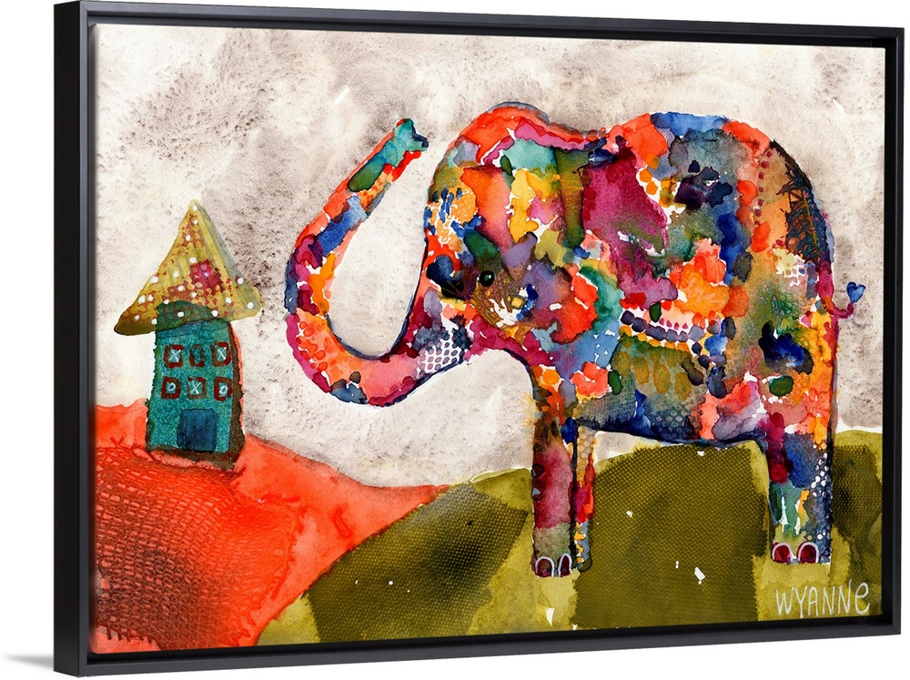 <p>A colorful elephant waving to a house on a hill.</p>