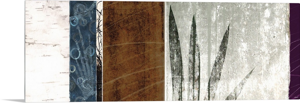 <p>Contemporary horizontal design of textured colors and leaves in multiple panels.</p>