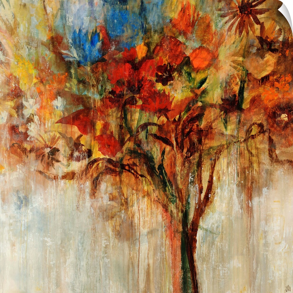 <p>Contemporary painting of a large cluster of flowers in various colors that form a bouquet with the appearance of a large tree of flowers on a neutral, streaked background.</p>