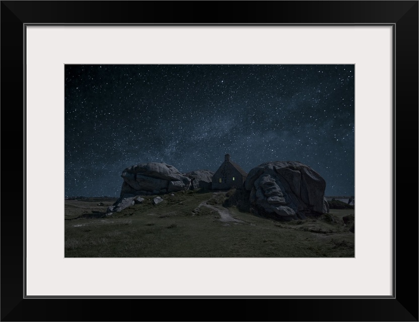 <p>A small house nestled between large rock formations under a night sky full of stars.</p>