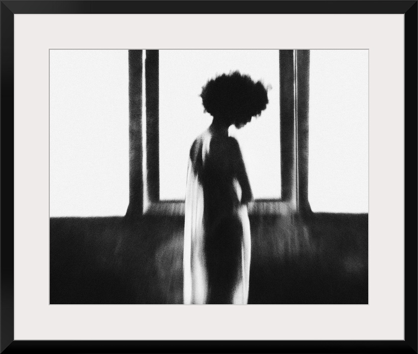 <p>A silhouetted female figure in sheer cloth stands in front of a large glowing window.</p>