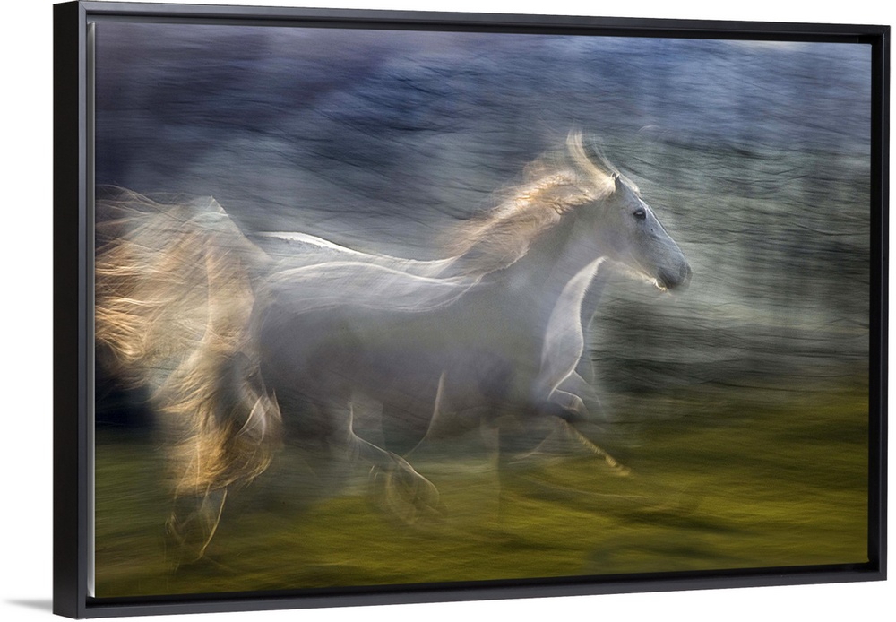 <p>Multiple exposure of a white horse galloping in a green field.</p>