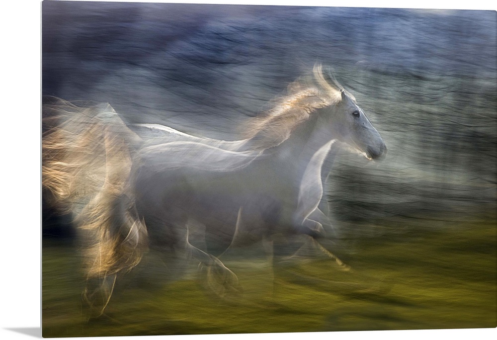 <p>Multiple exposure of a white horse galloping in a green field.</p>