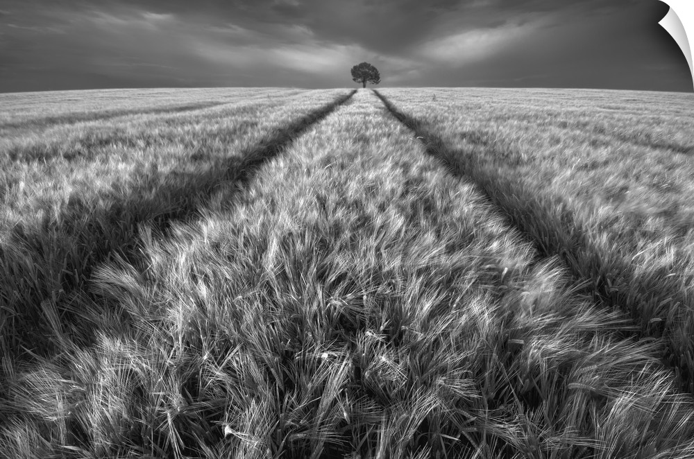 <p>A black and white photograph of a lone tree standing guard in a field.</p>
