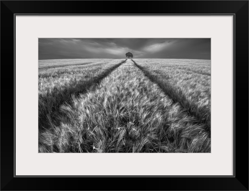 <p>A black and white photograph of a lone tree standing guard in a field.</p>