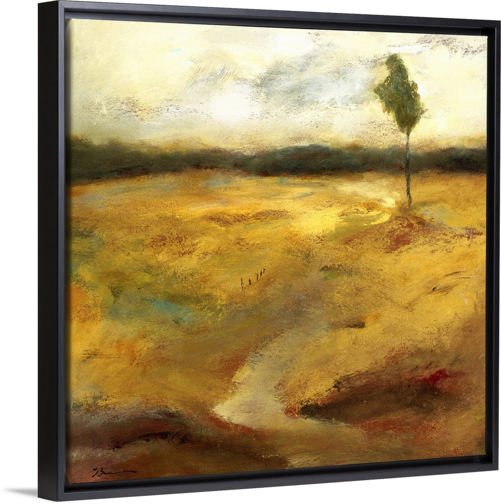 <p>Contemporary painting of a golden earthy toned landscape with a small lone tree in the distance.</p>