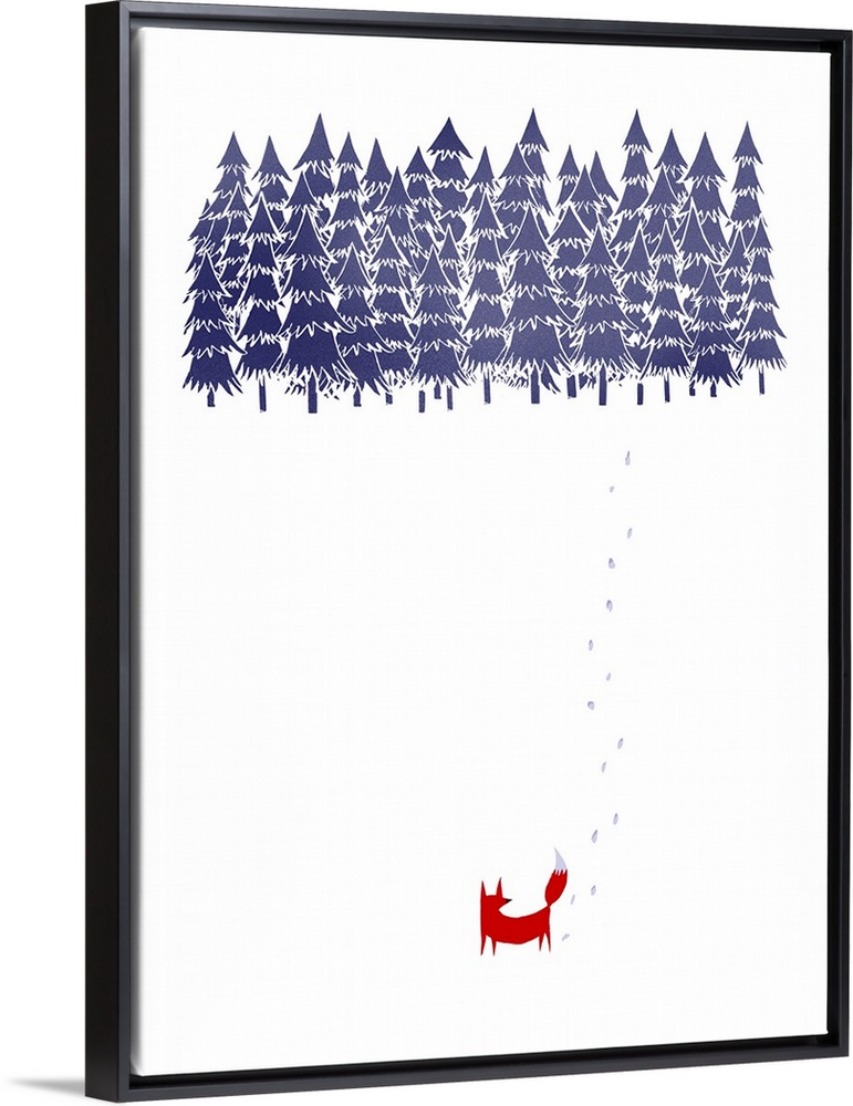 <p>Contemporary artwork of a red fox in a white environment looking at a thicket of trees.</p>