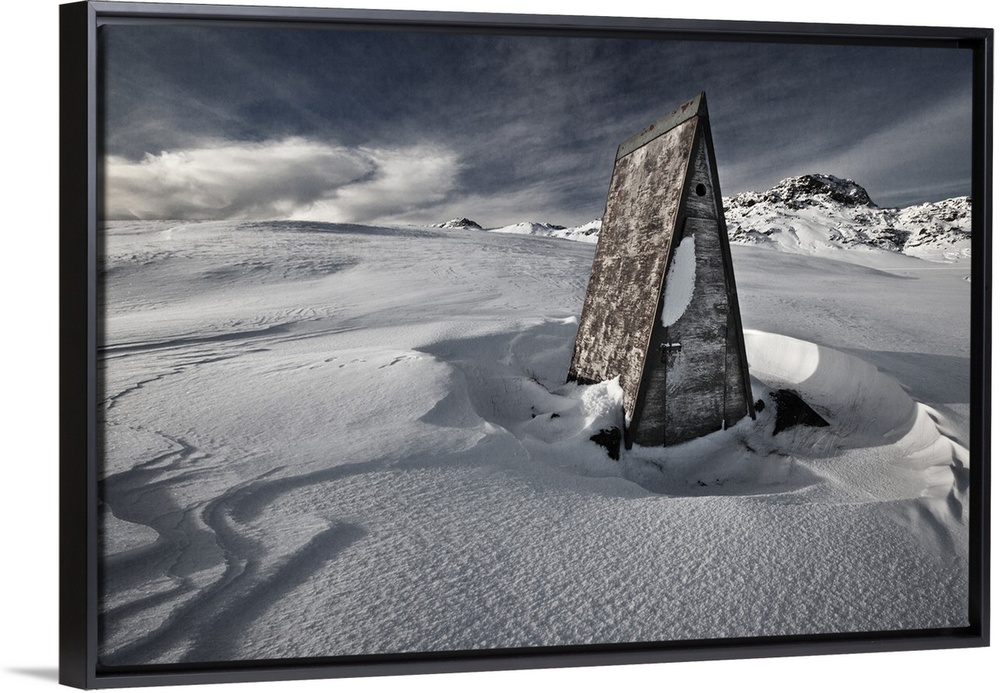 <p>A triangular shack in the deep snow on the Reykjanes Peninsula, Iceland.</p>