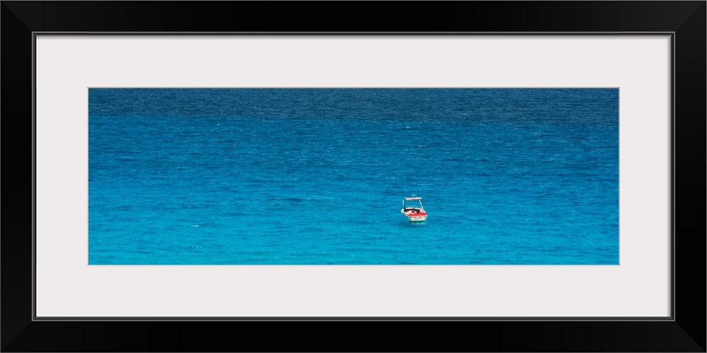 <p>Panoramic photograph of a single boat floating in the bright blue ocean. From the Viva Mexico Panoramic Collection.</p>