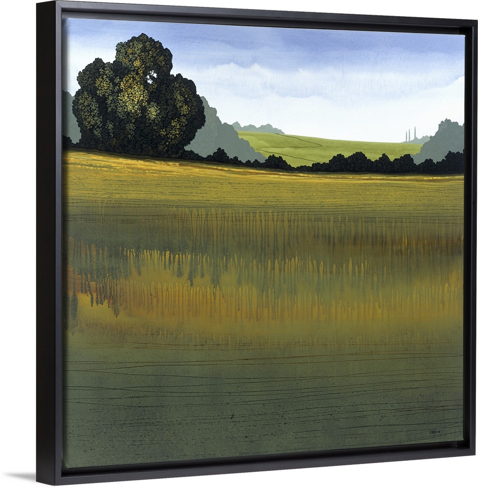<p>Square landscape painting with an open field and trees lining the background.</p>