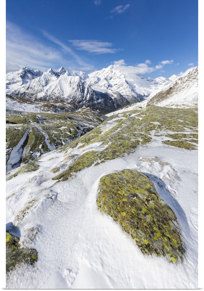 <p>Sunshine and snow at Alpe Fora with Monte Disgrazia in the background, Malenco Valley, Province of Sondrio, Valtellina, Lombardy, Italy</p>