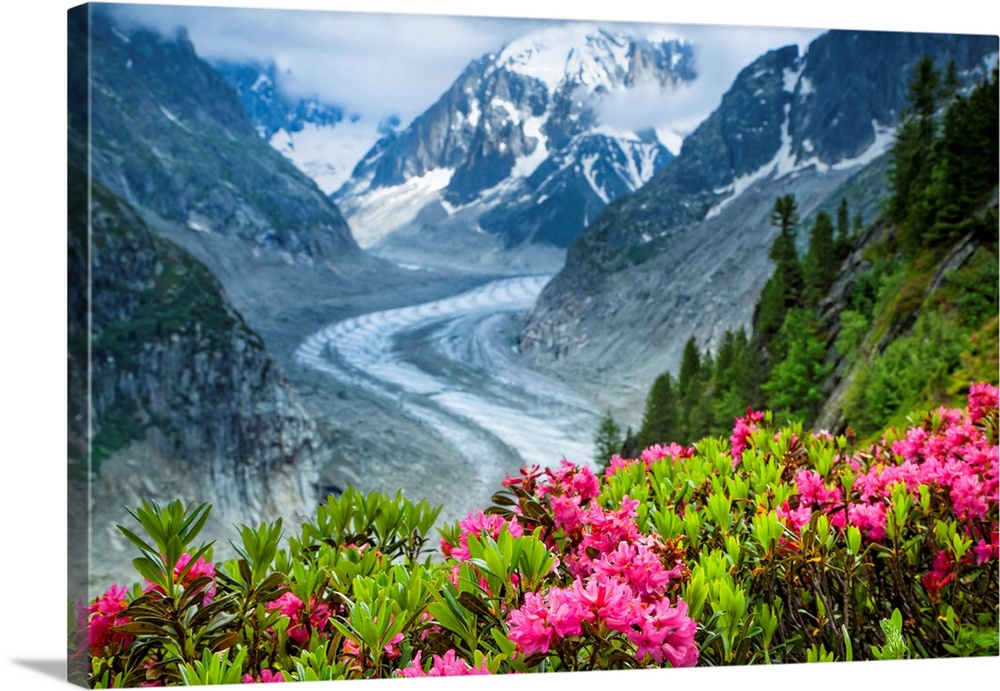 <p>Alpenrose (Rhododendron ferrugineum) flowers over Mer de Glacier and Grandes Jorasses, Alps, France</p>