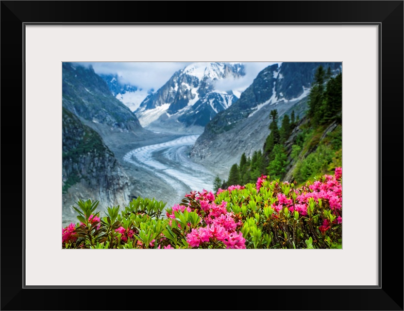<p>Alpenrose (Rhododendron ferrugineum) flowers over Mer de Glacier and Grandes Jorasses, Alps, France</p>