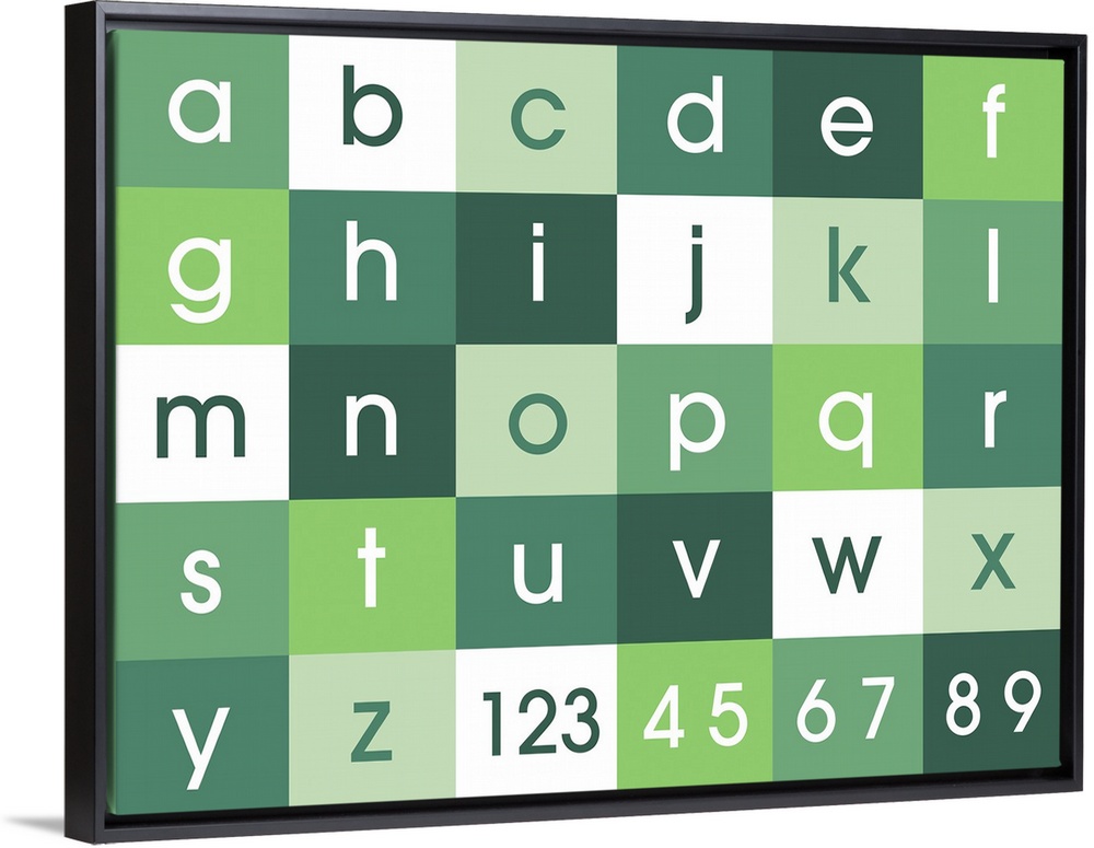 <p>Alphabet and numbers canvas print in shades of green. Contemporary design for kids and children's bedroom, nursery or play room. Perfect for learning the abc's.</p>