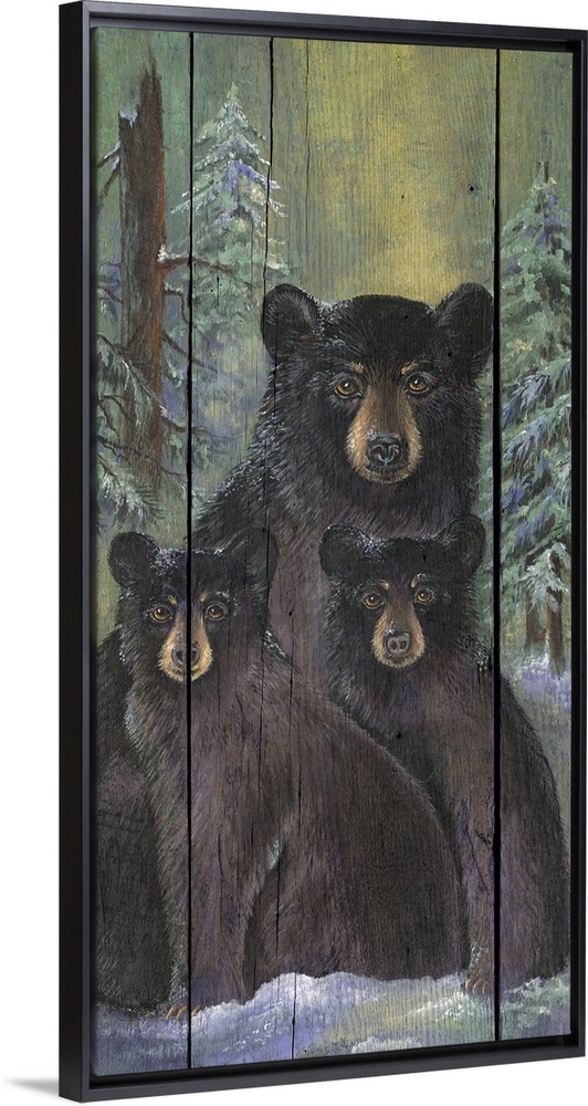 <p>Vertical panoramic artwork of three bears in the snow with a forest behind them painted on wood planks.</p>