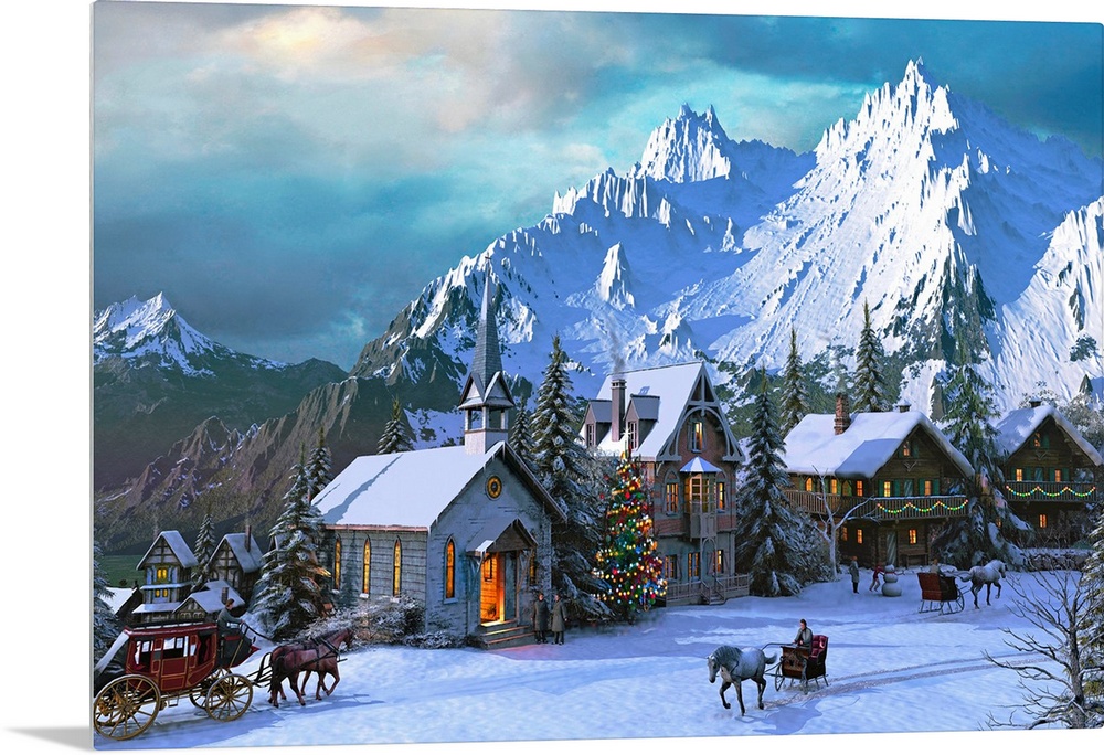 <p>A rustic village in the mountains covered with snow, all the homes have been decorated, and horse drawn carriages going up and down the lane in this holiday wall art.</p>