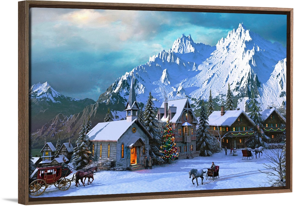 <p>A rustic village in the mountains covered with snow, all the homes have been decorated, and horse drawn carriages going up and down the lane in this holiday wall art.</p>