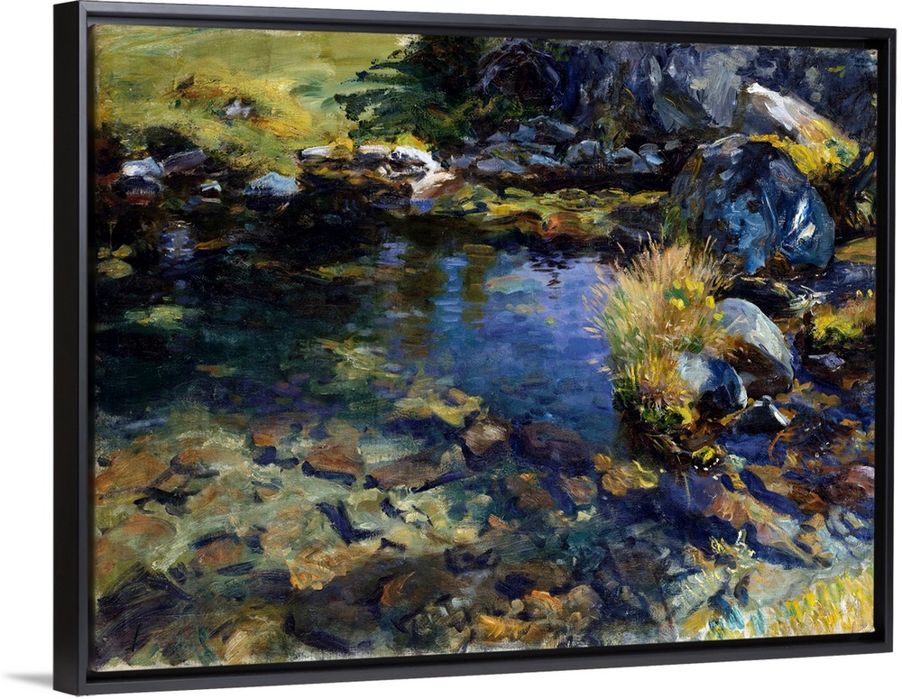 <p>Sargent's unflagging interest in recording effects of sunlight was challenged by the motif of flowing water. Alpine Pool belongs to a series of images in oil and watercolor that Sargent painted in the tiny hamlet of Purtud, in northern Italy. Here, and in the watercolor Brook and Meadow, he adopted a close vantage point and directed his gaze downward to the shimmering water-exploring its transparent and reflective qualities-as well as to the rocks and foliage along the banks. The result is a nearly abstract arrangement of form and color.</p>
