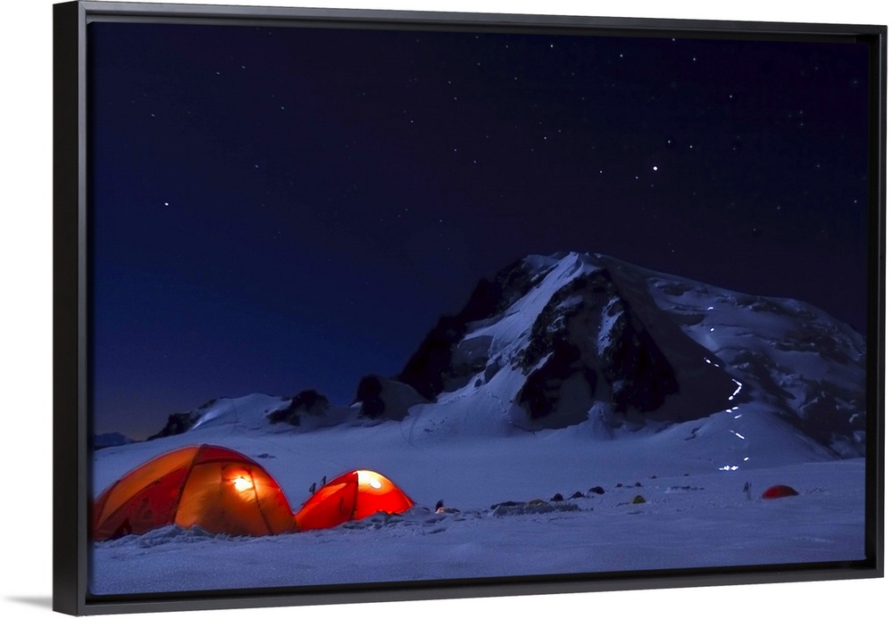 <p>Camping tents set up at night at the bast of a snowy mountain in the alps.</p>