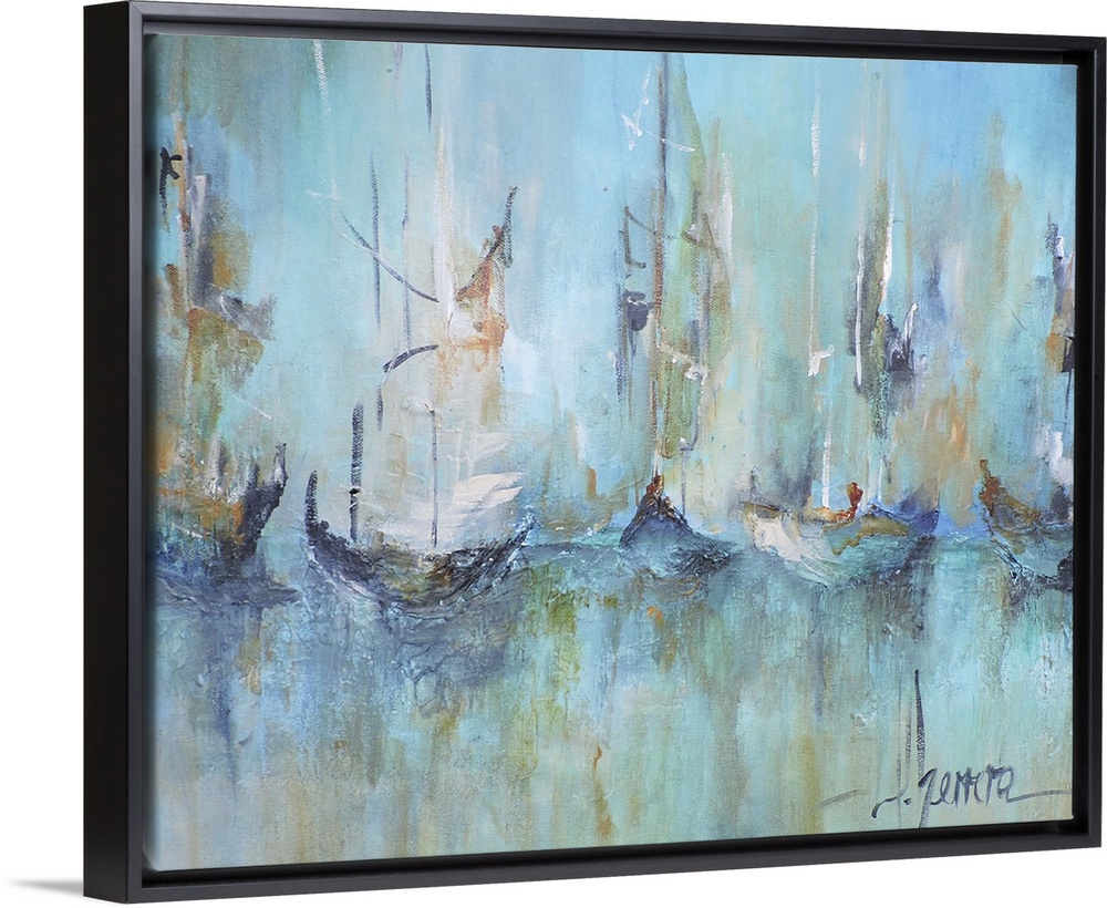 <p>Contemporary painting of a fleet of sailboats in turquoise water.</p>