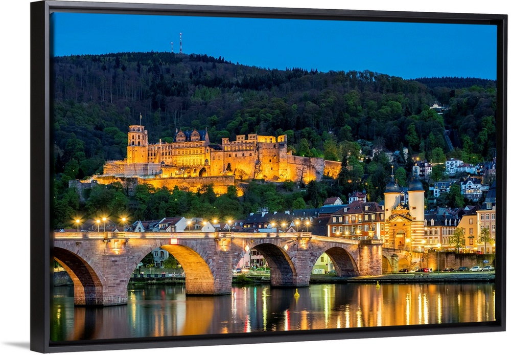 <p>Germany, Baden-Wurttemberg, Heidelberg. Alte Brucke (old bridge) and Schloss Heidelberg castle on the Neckar River at night.</p>