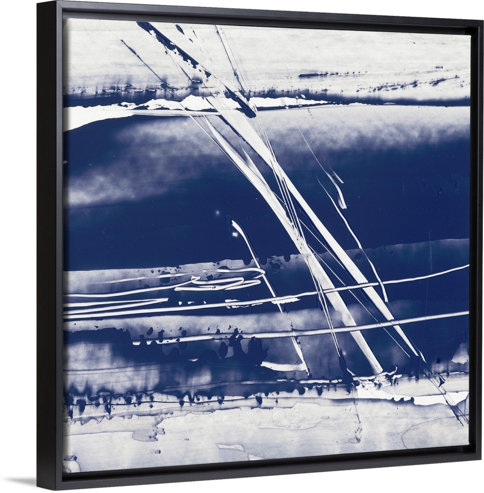 <p>Square abstract painting in blue and white with lines scratched across.</p>