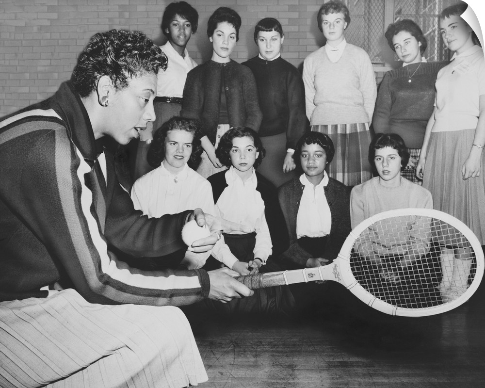 <p>Althea Gibson, speaks to young women attending a tennis clinic at Midwood High in Brooklyn. Dec. 1957. Earlier in the year, the African American won her first Wimbleton Ladies Singles and U.S. Open Championships.</p>