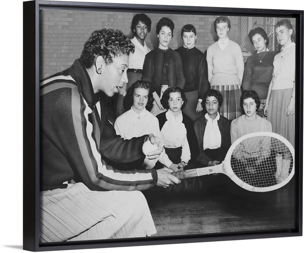 <p>Althea Gibson, speaks to young women attending a tennis clinic at Midwood High in Brooklyn. Dec. 1957. Earlier in the year, the African American won her first Wimbleton Ladies Singles and U.S. Open Championships.</p>