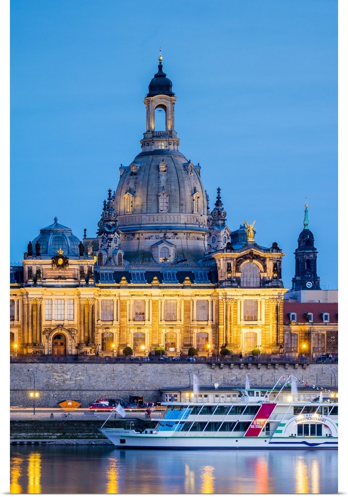 <p>Germany, Saxony, Dresden, Altstadt (Old Town). Hochschule fur Bildende Kunste (Dresden Academy of Fine Arts) and the cupola of the Frauenkirche along the Elbe River at night.</p>