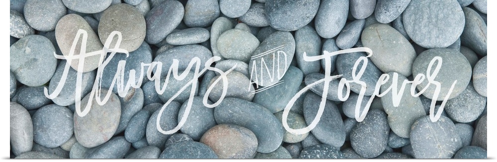 <p>"Always and Forever" handwritten in flowing script over an image of smooth round pebbles.</p>