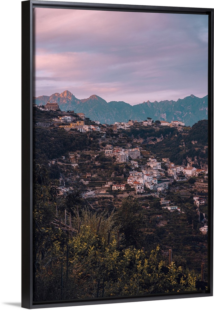<p>Cliffhouses and mountain backdrop during sunset in the UNESCO town of Amalfi in Amalfi Coast, Italy.</p>