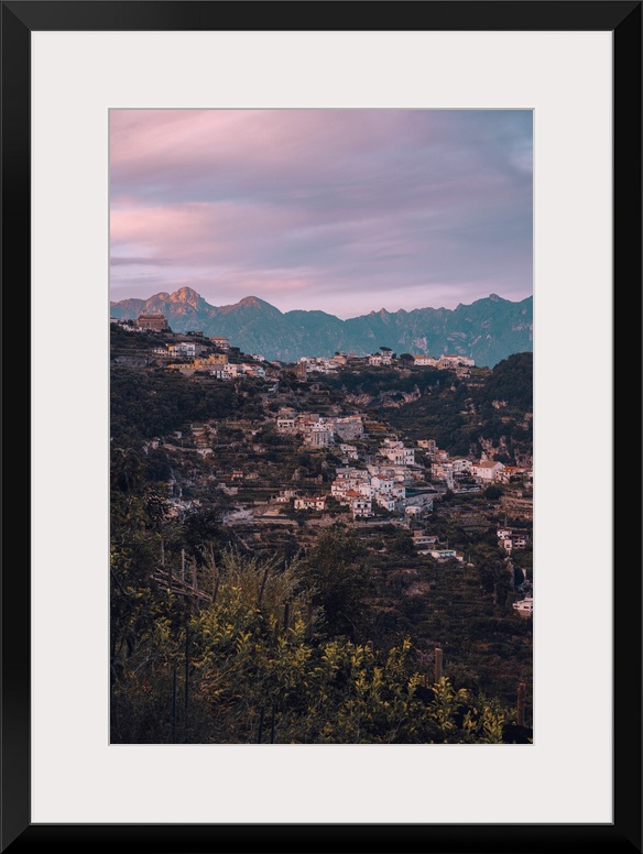 <p>Cliffhouses and mountain backdrop during sunset in the UNESCO town of Amalfi in Amalfi Coast, Italy.</p>
