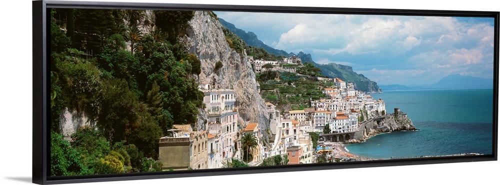 <p>Wide angle photograph taken of buildings that sit in the mountains and line the ocean coast in Italy.</p>