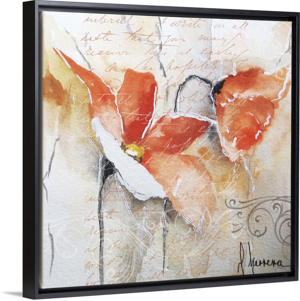 <p>Contemporary painting of orange poppy flowers embellished with handwriting and swirls.</p>