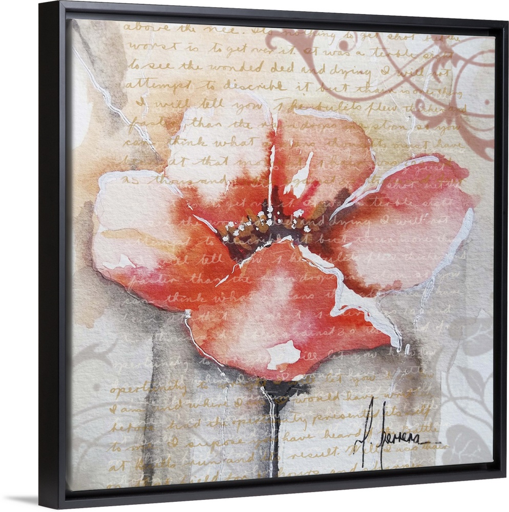 <p>Contemporary painting of an orange poppy flower embellished with handwriting and swirls.</p>