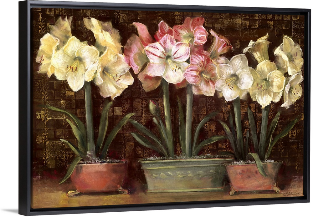 <p>Landscape home art docor on a big canvas of several potted flower arrangements sitting on a counter in front of a tiled, earth tone wall.</p>