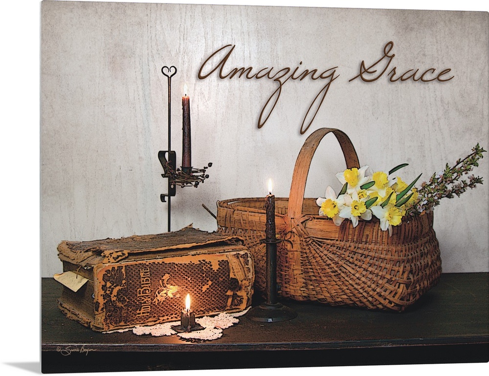 <p>This still-life photograph features rustic elements with the words, Amazing Grace, above it.</p>