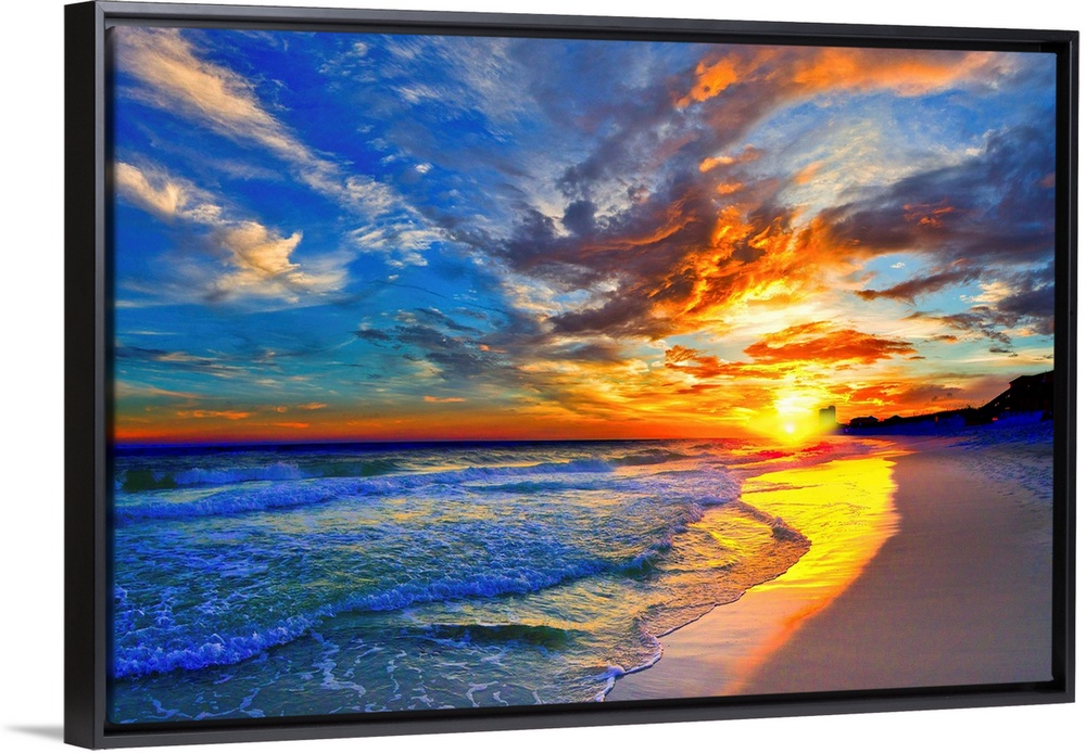 <p>An amazing sunset with red and blue sky and clouds. A blue seascape and beach below.</p>