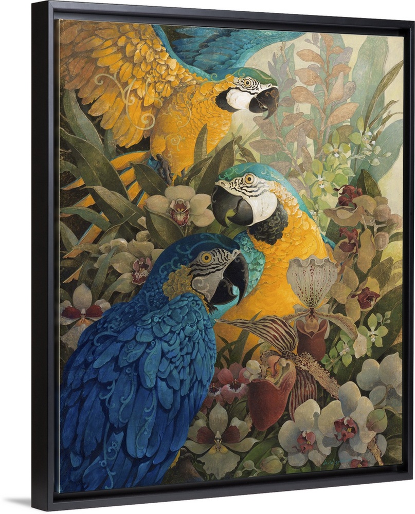 <p>Three blue and gold macaws among rainforest flowers in the Amazon.</p>