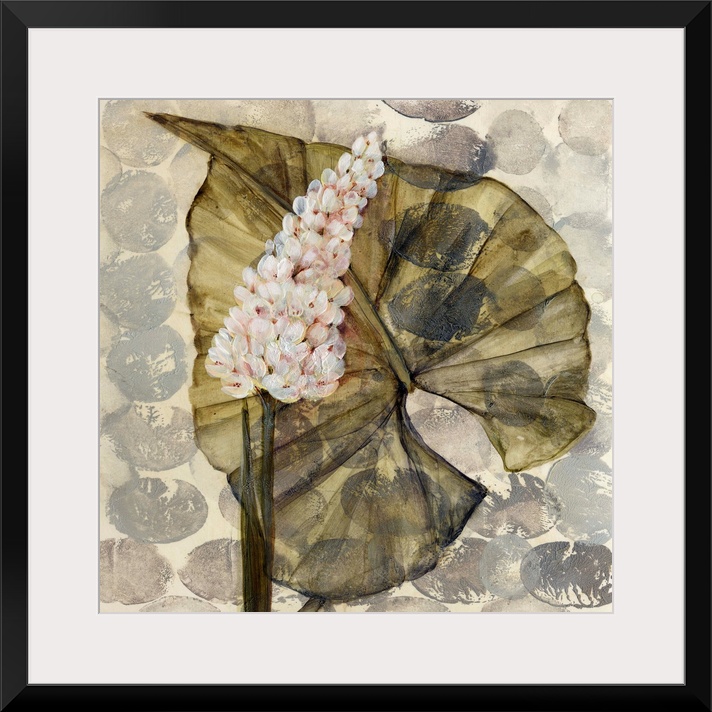 <p>Fine art painting of layered leaves and flowers on a gray patterned background by Amore.</p>