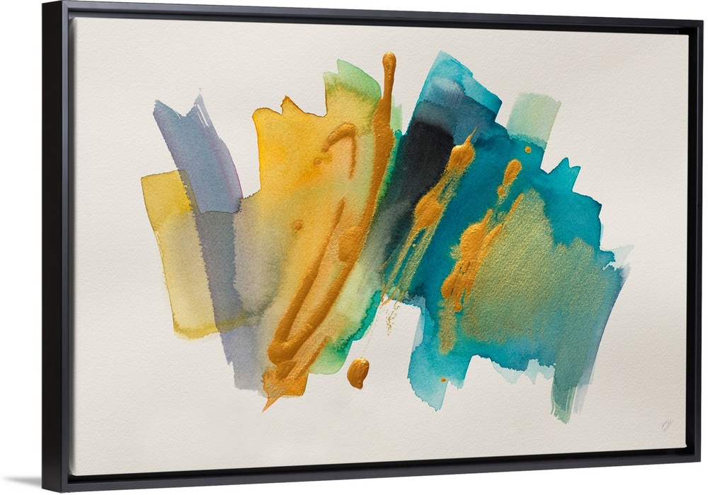 <p>Gold and blue brush strokes decorate a horizontal abstract artwork.</p>