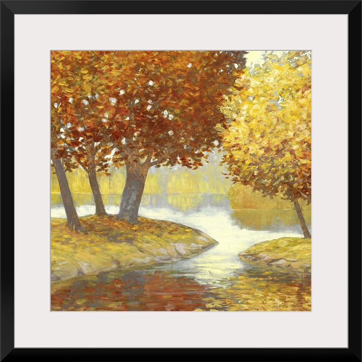 <p>Contemporary painting of trees along the riverside in the fall.</p>