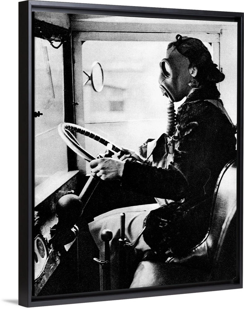 <p>A British woman wearing a gas mask while training as an ambulance driver in London, England, following the outbreak of World War II, September 1939.</p>