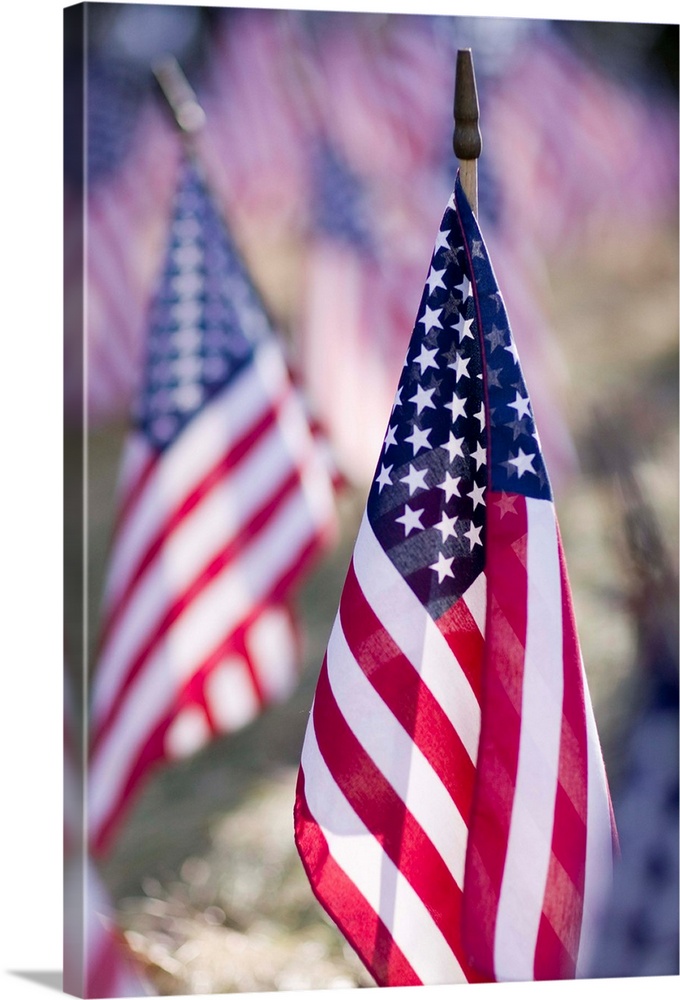 <p>American flags laid out in a field to symbolize soldiers that have died in war.</p>