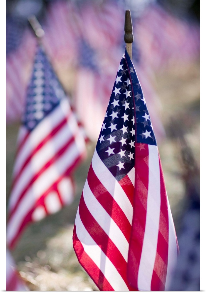 <p>American flags laid out in a field to symbolize soldiers that have died in war.</p>